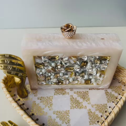 Want to add a personal touch? We offer customization options to make this clutch truly one-of-a-kind. Perfect for a night out or a special occasion, this Resin Clutch with Embellishment is sure to turn heads.